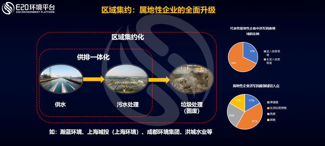 區(qū)域集約指同區(qū)域內(nèi)的管理集約,包括同要素和不同要素集約,主要實(shí)施主體是區(qū)域性環(huán)境綜合服務(wù)商(E20環(huán)境產(chǎn)業(yè)B方陣等),其屬地性、區(qū)域性強(qiáng),企業(yè)一般由當(dāng)?shù)貒?guó)資委控股,不通過(guò)競(jìng)爭(zhēng)性招標(biāo)直接承接區(qū)域內(nèi)項(xiàng)目。區(qū)域集約主要是屬地型企業(yè)的全面升級(jí),這些企業(yè)往往從供水開始,逐步進(jìn)入污水處理,再進(jìn)入垃圾處理行業(yè)。