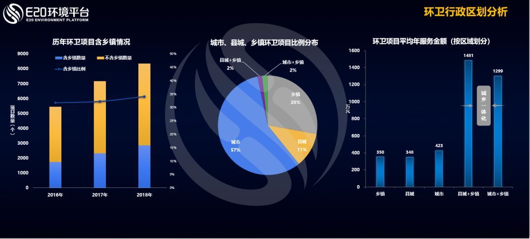 從上圖顯示的行政區(qū)劃的角度看,我國(guó)環(huán)衛(wèi)項(xiàng)目鄉(xiāng)鎮(zhèn)的比例總體穩(wěn)定,略有上揚(yáng),項(xiàng)目數(shù)量在2018年達(dá)到了新高。凡是城鄉(xiāng)一體化項(xiàng)目的平均年服務(wù)金額均高于其他項(xiàng)目,這也說(shuō)明城鄉(xiāng)一體化服務(wù)帶來(lái)了更大的合同空間。