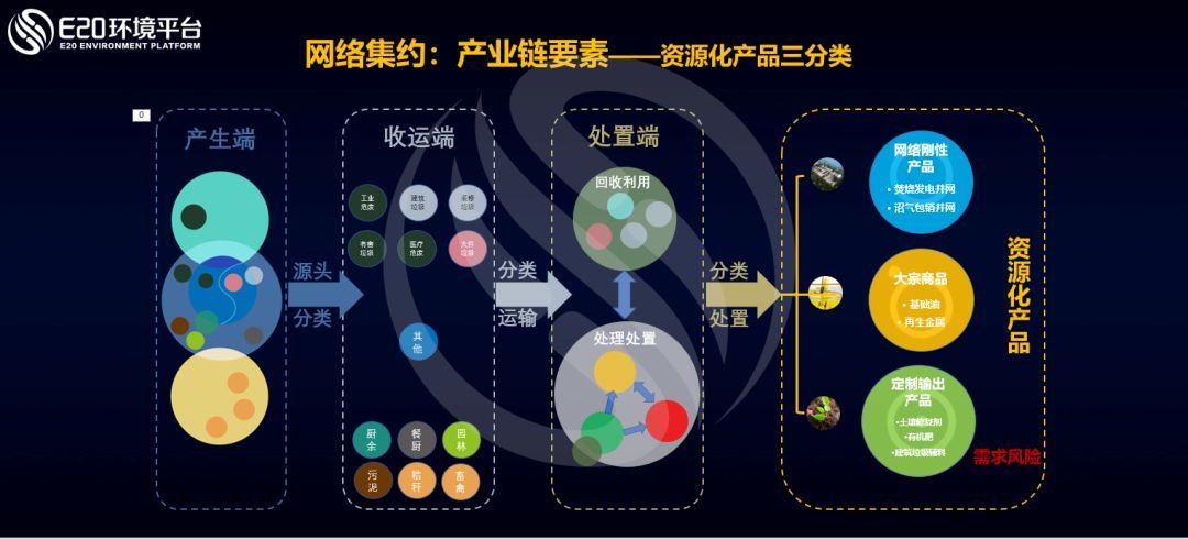 上圖對(duì)城市各種固廢的網(wǎng)絡(luò)集約進(jìn)行了總結(jié),其中廢物實(shí)現(xiàn)資源化的模式我們進(jìn)行了分類,可分為網(wǎng)絡(luò)剛性產(chǎn)品、大宗產(chǎn)品以及定制輸出產(chǎn)品。網(wǎng)絡(luò)剛性產(chǎn)品包括焚燒發(fā)電并網(wǎng),沼氣包銷并網(wǎng);大宗產(chǎn)品包括基礎(chǔ)油,再生金屬等;定制輸出產(chǎn)品包括土壤修復(fù)劑,有機(jī)肥,建筑垃圾輔料等。其中,對(duì)于網(wǎng)絡(luò)剛性產(chǎn)品和大宗產(chǎn)品,都不太用考慮后端消納的痛點(diǎn)(即不需要面對(duì)資源化產(chǎn)品銷售的需求風(fēng)險(xiǎn)),然而定制輸出類產(chǎn)品則在這個(gè)方面成為痛點(diǎn),也是屬于網(wǎng)絡(luò)集約所提供的可持續(xù)開發(fā)和差異化競(jìng)爭(zhēng)的市場(chǎng)機(jī)會(huì)。