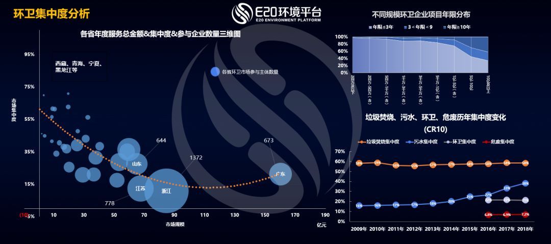 上圖顯示,環(huán)衛(wèi)集中度呈現(xiàn)一個(gè)反拋物線的狀態(tài)。在每個(gè)省來(lái)看,當(dāng)環(huán)衛(wèi)市場(chǎng)化項(xiàng)目剛剛出現(xiàn)的時(shí)候,大概只有一兩家、兩三家企業(yè)去參與,或者少數(shù)企業(yè)來(lái)參與。市場(chǎng)發(fā)展到一定程度,例如圖中浙江省,開始出現(xiàn)大量項(xiàng)目的時(shí)候,集中度會(huì)下降,比如浙江有1372家環(huán)衛(wèi)企業(yè)。而隨著市場(chǎng)化的推進(jìn),市場(chǎng)規(guī)模進(jìn)一步擴(kuò)大之后,寡頭壟斷開始逐步出現(xiàn),行業(yè)集中度出現(xiàn)上揚(yáng),大企業(yè)龍頭效應(yīng)出現(xiàn)。比如廣東作為市場(chǎng)規(guī)模最大的省份,其參與主體開始減少,集中度會(huì)上揚(yáng)。對(duì)不同年限項(xiàng)目的歸屬進(jìn)行分析來(lái)看,環(huán)衛(wèi)行業(yè)雖然小企業(yè)很多,但是10年以上大體量大項(xiàng)目大都被大型企業(yè)握在手中。(相關(guān)鏈接→ 啟迪桑德年報(bào)看點(diǎn):環(huán)衛(wèi)業(yè)務(wù)漲125%,圍繞環(huán)衛(wèi)及物流買買買)