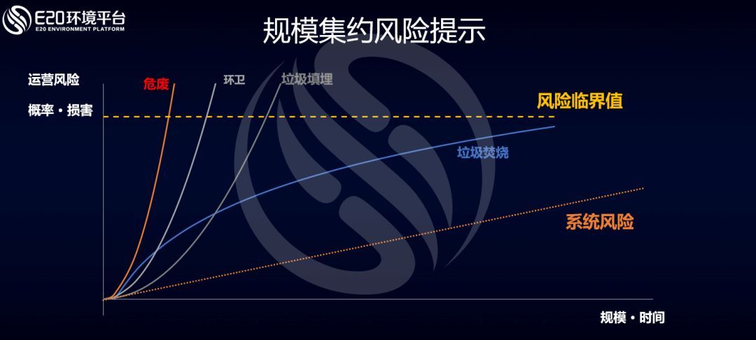 在對(duì)環(huán)境細(xì)分領(lǐng)域的規(guī)模集約介紹后,通過(guò)這張二維分析圖對(duì)各行業(yè)的規(guī)模集約進(jìn)行總結(jié)。此圖橫軸為規(guī)模及時(shí)間兩個(gè)要素 ,縱軸為運(yùn)營(yíng)風(fēng)險(xiǎn)的概率及損害。危廢行業(yè)因?yàn)檫\(yùn)營(yíng)風(fēng)險(xiǎn)大,且隨著規(guī)模或時(shí)間累計(jì)還會(huì)繼續(xù)上升,造成的損害也最大,因此斜率最高。而在環(huán)衛(wèi)行業(yè)中,規(guī)模越大,涉及員工越多,管理越容易出現(xiàn)問(wèn)題。垃圾填埋行業(yè)也隨著規(guī)模的增加和時(shí)間的延長(zhǎng),面臨越來(lái)越高的風(fēng)險(xiǎn)提示,反倒是垃圾焚燒行業(yè),在規(guī)范化的管理及運(yùn)營(yíng)下,相對(duì)更有機(jī)會(huì)將運(yùn)營(yíng)風(fēng)險(xiǎn)控制在可控范圍內(nèi)。當(dāng)然,要想控制風(fēng)險(xiǎn),除了自身努力,也離不開本次論壇發(fā)言的以及其他的優(yōu)秀的技術(shù)供應(yīng)商和他們的生態(tài)合作。我們上榜的優(yōu)秀技術(shù)和裝備提供商榜單請(qǐng)參見(jiàn)→ 【年度大榜】2018固廢&環(huán)衛(wèi)企業(yè)業(yè)績(jī)榜及影響力企業(yè)出爐。