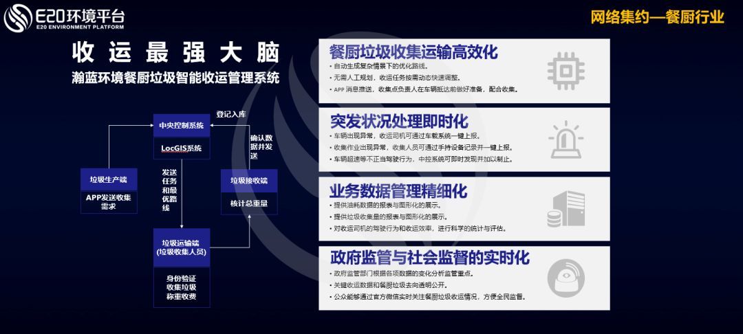 在餐廚行業(yè),也有企業(yè)運(yùn)用信息化手段建立餐廚垃圾智能收運(yùn)管理系統(tǒng),對(duì)餐廚垃圾收集運(yùn)輸高效化、對(duì)突發(fā)情況處理即時(shí)化、對(duì)業(yè)務(wù)數(shù)據(jù)管理精細(xì)化、對(duì)政府監(jiān)管與社會(huì)監(jiān)督實(shí)時(shí)化。