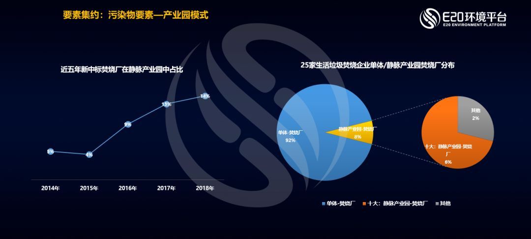 通過(guò)近幾年的數(shù)據(jù)觀察,我們發(fā)現(xiàn)新中標(biāo)焚燒廠在靜脈產(chǎn)業(yè)園中的占比正在逐漸提升,2018年已達(dá)14%。目前,垃圾焚燒十大影響力企業(yè)在靜脈產(chǎn)業(yè)園中的焚燒廠占比已達(dá)6%。同時(shí),我們還觀察到循環(huán)經(jīng)濟(jì)產(chǎn)業(yè)園模式已成為新進(jìn)入的實(shí)力強(qiáng)勁的非垃圾焚燒影響力企業(yè)(如盈峰、雅居樂(lè))在固廢處理行業(yè)激烈競(jìng)爭(zhēng)中彎道超車的一種打法。