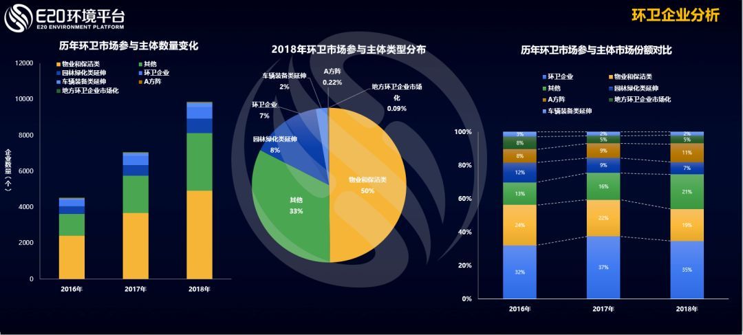 從環(huán)衛(wèi)市場(chǎng)參與主體來(lái)看,根據(jù)E20環(huán)境平臺(tái)E標(biāo)通統(tǒng)計(jì)顯示,近三年來(lái),參與環(huán)衛(wèi)市場(chǎng)化項(xiàng)目爭(zhēng)奪的環(huán)衛(wèi)企業(yè)從五千家漲到了一萬(wàn)家,參與主體大幅擴(kuò)增導(dǎo)致行業(yè)集中度未出現(xiàn)增長(zhǎng)。(相關(guān)鏈接→ 5000+企業(yè)進(jìn)軍環(huán)衛(wèi)市場(chǎng) 環(huán)衛(wèi)一體化讓企業(yè)“腦洞”大開)E20研究院數(shù)據(jù)中心對(duì)環(huán)衛(wèi)企業(yè)進(jìn)行了企業(yè)原有業(yè)務(wù)來(lái)源分析可以看出,從事物業(yè)保潔、園林綠化等多種企業(yè)紛紛布局環(huán)衛(wèi)業(yè)務(wù)。在上圖右側(cè)特別值得注意的是:來(lái)自垃圾焚燒A方陣的部分投資運(yùn)營(yíng)企業(yè)已進(jìn)入環(huán)衛(wèi),在前年8%的市場(chǎng)規(guī)模占比,在今年已經(jīng)上漲到11%,在進(jìn)入企業(yè)大擴(kuò)容的基礎(chǔ)上其份額反而逆勢(shì)穩(wěn)健提高,說(shuō)明我們這些垃圾焚燒影響力企業(yè)的市場(chǎng)沖擊力何等之大。