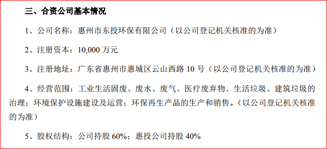 公告顯示,東江環(huán)保擬與與惠州市投資管理集團(tuán)有限公司(簡(jiǎn)稱“慧投公司”)共同出資在惠州市成立合資公司,公司名擬定為“惠州市東投環(huán)保有限公司”,注冊(cè)資本1億元,東江環(huán)保與慧投公司分別出資6000萬(wàn)與4000萬(wàn)元人民幣,分別持股60%和40%的股權(quán)。