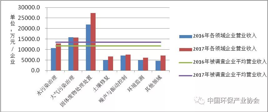 2017年,統(tǒng)計(jì)范圍內(nèi)企業(yè)營(yíng)業(yè)收入總額11681.4億元,營(yíng)業(yè)利潤(rùn)總額1237.0億元。其中,環(huán)保業(yè)務(wù)營(yíng)業(yè)收入6209.0億元,占比為53.2%,環(huán)保業(yè)務(wù)營(yíng)業(yè)利潤(rùn)804.5億元,占比為65.0%。同比來(lái)看,營(yíng)業(yè)收入總額增長(zhǎng)了17.5%,營(yíng)業(yè)利潤(rùn)降低了6.9%,其中,環(huán)保業(yè)務(wù)營(yíng)業(yè)收入增長(zhǎng)了17.9%,環(huán)保業(yè)務(wù)營(yíng)業(yè)利潤(rùn)增長(zhǎng)了15.2%。具體到細(xì)分領(lǐng)域,與2016年相比,除大氣污染防治領(lǐng)域外,水污染防治、固廢處置與資源化、環(huán)境監(jiān)測(cè)領(lǐng)域企業(yè)的營(yíng)業(yè)收入、環(huán)保業(yè)務(wù)營(yíng)業(yè)收入、營(yíng)業(yè)利潤(rùn)、環(huán)保業(yè)務(wù)營(yíng)業(yè)利潤(rùn)均有不同程度的增長(zhǎng)。
