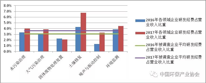 從創(chuàng)新能力看,被調(diào)查企業(yè)研發(fā)經(jīng)費(fèi)占營(yíng)業(yè)收入的比重高于全國(guó)規(guī)模以上工業(yè)企業(yè)研發(fā)經(jīng)費(fèi)支出占營(yíng)業(yè)收入的比重。與2016年相比,2017年相同樣本企業(yè)的平均研發(fā)經(jīng)費(fèi)支出、研發(fā)經(jīng)費(fèi)支出占營(yíng)業(yè)收入的比重均有所提高。環(huán)保企業(yè)自主知識(shí)產(chǎn)權(quán)開(kāi)發(fā)和技術(shù)創(chuàng)新活躍,具有高學(xué)歷、高級(jí)技術(shù)職稱的研發(fā)、管理及工程技術(shù)人員占比較高,人才基礎(chǔ)總體較好。