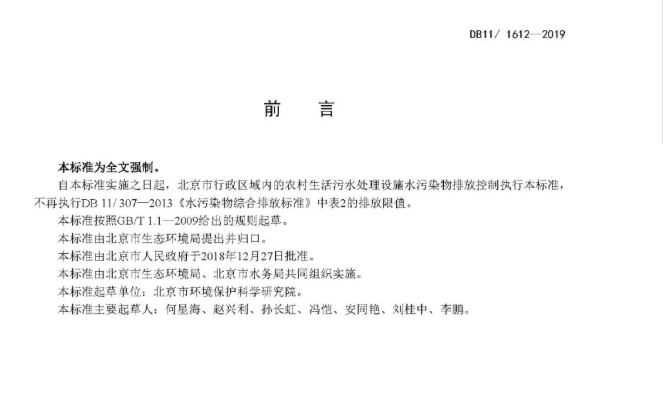 為落實《中共中央 國務(wù)院關(guān)于實施鄉(xiāng)村振興戰(zhàn)略的意見》和《農(nóng)村人居環(huán)境整治三年行動方案》,改善農(nóng)村人居環(huán)境,建設(shè)美麗宜居鄉(xiāng)村,穩(wěn)步推進農(nóng)村生活污水治理,2019年1月7日,北京市制訂并發(fā)布《農(nóng)村生活污水處理設(shè)施水污染物排放標準》(DB11/ 1612-2019)(以下簡稱“標準”)。
