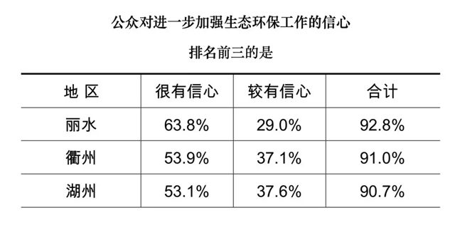 88.7%的公眾對本地黨委政府進一步加強生態(tài)建設和環(huán)境保護工作、建設美麗浙江充滿信心,全省五個地區(qū)對進一步加強生態(tài)環(huán)保工作的信心率超過九成,其中麗水最高。