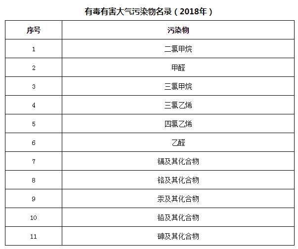 《有毒有害大氣污染物名錄(2018年)》出爐