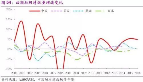 增速方面,美國近30年間雖持續(xù)增長,但復(fù)合年均增速不足1%;德國基本實(shí)現(xiàn)固廢0增長;日本更是從2000年起連年實(shí)現(xiàn)固廢負(fù)增長。中國近30年復(fù)合年均增速略超5%,近7年基本維持在4%左右。按照《“十三五”全國城鎮(zhèn)化生活垃圾無害化處理設(shè)施建設(shè)規(guī)劃》,預(yù)計(jì)到2020年中國垃圾清運(yùn)量將達(dá)4億噸,未來4年年均增速有望持續(xù)超10%。