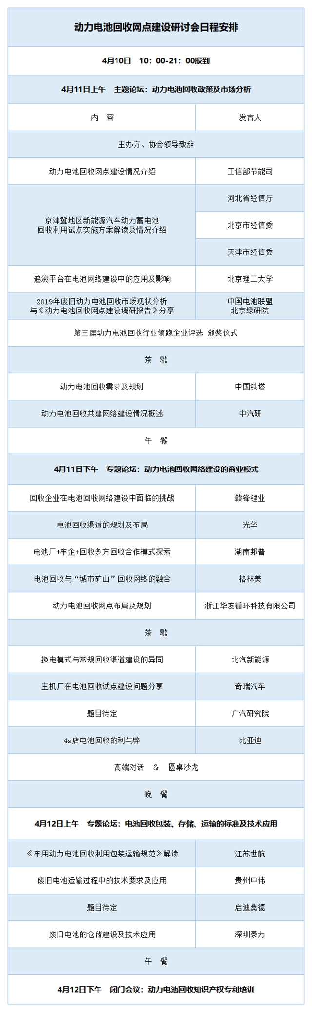 本次研討會將針對回收網點建設的政策標準、商業(yè)模式及布局規(guī)劃、網點建設的技術問題進行相應的分析和探討,為相關企業(yè)解決回收網絡及渠道建設提供方案及思路。會議擬邀請工信部節(jié)能司、河北省經信廳北京市經信委天津市經信委等政府官員,北京綠研院、中汽研、廣汽研究院等動力電池權威機構,中國鐵塔、贛鋒鋰業(yè)、光華、湖南邦普、格林美、浙江華友循環(huán)、北汽新能源、奇瑞汽車、深圳泰力、比亞迪、江蘇世航、貴州中偉、啟迪桑德等行業(yè)領軍企業(yè),圍繞動力電池回收網點建設相關熱點話題,深度透析動力電池回收政策與規(guī)劃布局,以期促進動力電池回收利用示范體系建立。