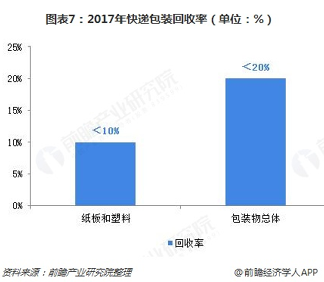 2017年,包裝快遞所用紙板和塑料實際回收率不到10%,包裝物總體回收率不到20%。