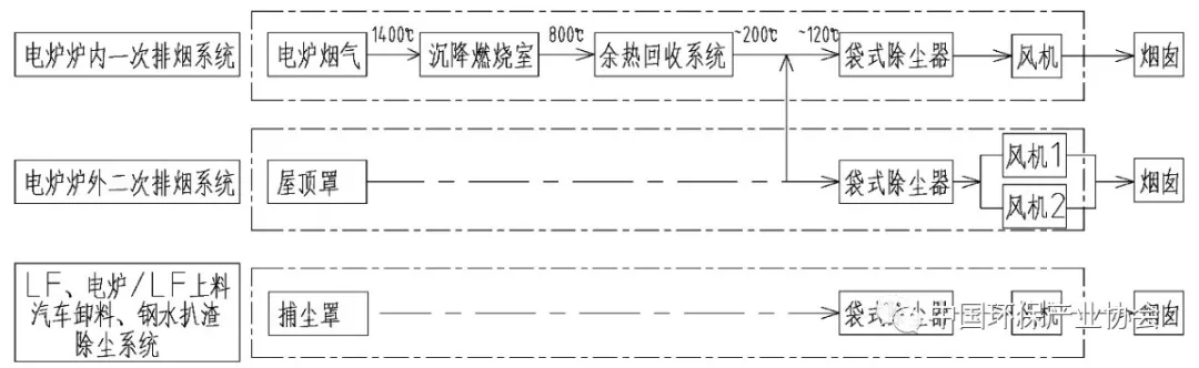 電爐爐內(nèi)排煙經(jīng)余熱鍋爐回收余熱降溫后經(jīng)袋式除塵器除塵達標排放;采用“半密閉導(dǎo)流煙罩+屋頂貯留集塵罩+鐵水溜槽排煙罩”相結(jié)合的方式全過程捕集電爐在加廢鋼、兌鐵水、熔煉、出鋼等過程中產(chǎn)生的排煙,煙氣在半密閉導(dǎo)流煙罩及鐵水溜槽排煙罩導(dǎo)流作用下流經(jīng)屋頂貯留集塵罩,再經(jīng)袋式除塵器除塵達標排放;采用爐內(nèi)一次排煙和爐外移動半密閉罩二次排煙相結(jié)合的方式捕集鋼包電弧爐煙氣,經(jīng)袋式除塵器除塵達標排放。