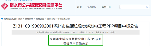 2019年2月27日,河北省深州市生活垃圾焚燒發(fā)電工程PPP項目發(fā)布資格預審結果公告。
