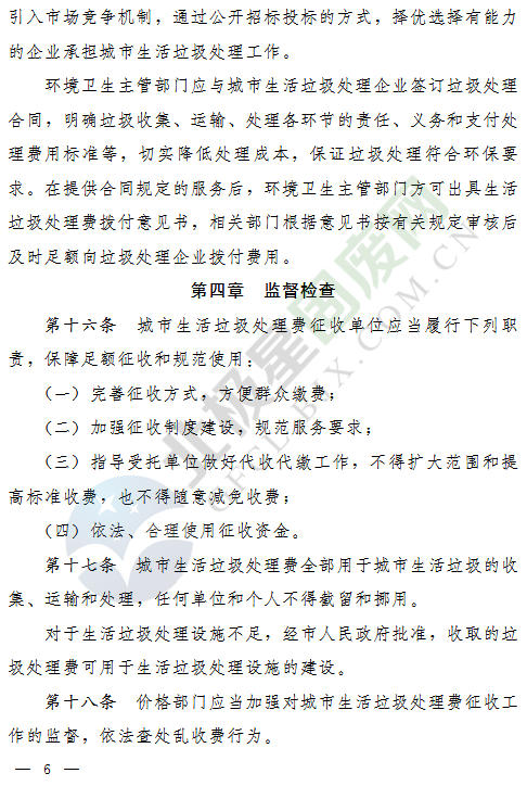 答:國(guó)家建設(shè)部《城市生活垃圾管理辦法》及《河南省城市生活垃圾處理管理辦法》中規(guī)定:國(guó)家對(duì)城市生活垃圾的清掃、收集、運(yùn)輸和處理服務(wù)實(shí)行收費(fèi)制度。