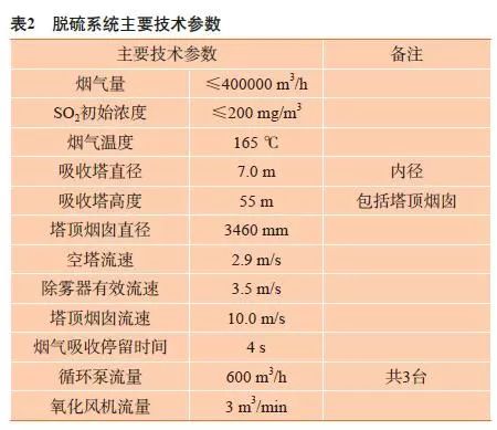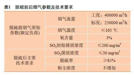 新建的130 T高溫超高壓高爐煤氣鍋爐排放的煙氣含硫最高200 mg/m3,粉塵5 mg/m3。根據(jù)當(dāng)前國(guó)家環(huán)保的排放限值是:SO2 30 mg/m3和粉塵5 mg/m3,因此需要對(duì)排放煙氣設(shè)計(jì)脫硫方案(見表1),使排放煙氣SO2含量降到30 mg/m3以下,同時(shí)脫硫過程不得增加粉塵濃度,并且保證脫硫機(jī)組年穩(wěn)定運(yùn)行時(shí)間≥8400 h,除霧器出口機(jī)械水含量≤75 mg/m3。