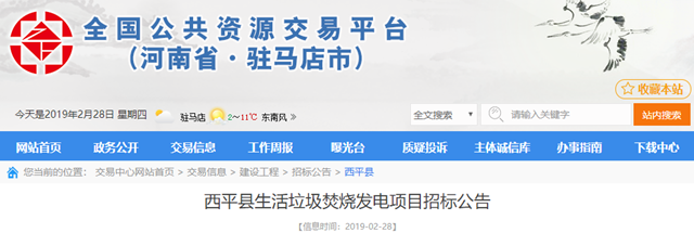 2019年2月28日,河南省駐馬店市西平縣生活垃圾焚燒發(fā)電項目發(fā)布招標公告。