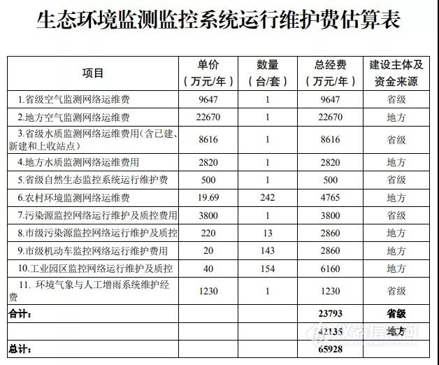 對于運行維護,包括省級空氣監(jiān)測網(wǎng)絡運維費、地方空氣監(jiān)測網(wǎng)絡運維費、省級水質(zhì)監(jiān)測網(wǎng)絡運維費、地方水質(zhì)監(jiān)測網(wǎng)絡運維費用、省級自然生態(tài)監(jiān)控系統(tǒng)運行維護費、農(nóng)村環(huán)境監(jiān)測網(wǎng)絡運維費、污染源監(jiān)控網(wǎng)絡運行維護及質(zhì)控費用、市級污染源監(jiān)控網(wǎng)絡運行維護及質(zhì)控、市級機動車監(jiān)控網(wǎng)絡運行維護費用、工業(yè)園區(qū)監(jiān)控網(wǎng)絡運行維護及質(zhì)控、環(huán)境氣象與人工增雨系統(tǒng)維護經(jīng)費等。