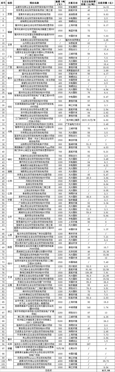 2018全年垃圾焚燒中標(biāo)(簽約)項(xiàng)目逾100個(gè),總投資達(dá)618億