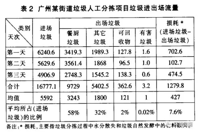 根據(jù)多年的垃圾調(diào)查實踐,并連續(xù)三天對廣州某街道垃圾人工分揀項目的調(diào)查,在每天平均3人工作7小時、在垃圾分揀平臺(平臺設(shè)置濾水、通風(fēng)除臭)上,主要將生活垃圾分為餐廚垃圾和其它垃圾兩大類,并揀出其中少量的塑料瓶和玻璃,分揀垃圾量和各類垃圾成分結(jié)果如表2所示。
