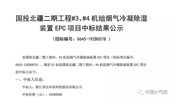 浙江菲達(dá)環(huán)??萍脊煞萦邢薰局袠?biāo)國投北疆二期工程#3、#4機組煙氣冷凝除濕裝置EPC項目,中標(biāo)價格為64980000元。
