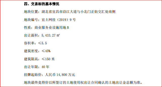 公告顯示,地塊范圍位于宜昌市西陵區(qū)沿江大道與小北門正街交匯處南側(cè),規(guī)劃總建設(shè)面積約3.5萬平方米,出讓年限為40年,掛牌起始價為1.48億元。桑德置業(yè)本次參與競拍國有土地使用權(quán),是為滿足未來業(yè)務(wù)發(fā)展對辦公場所的需要。