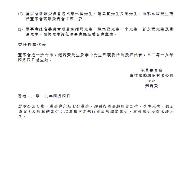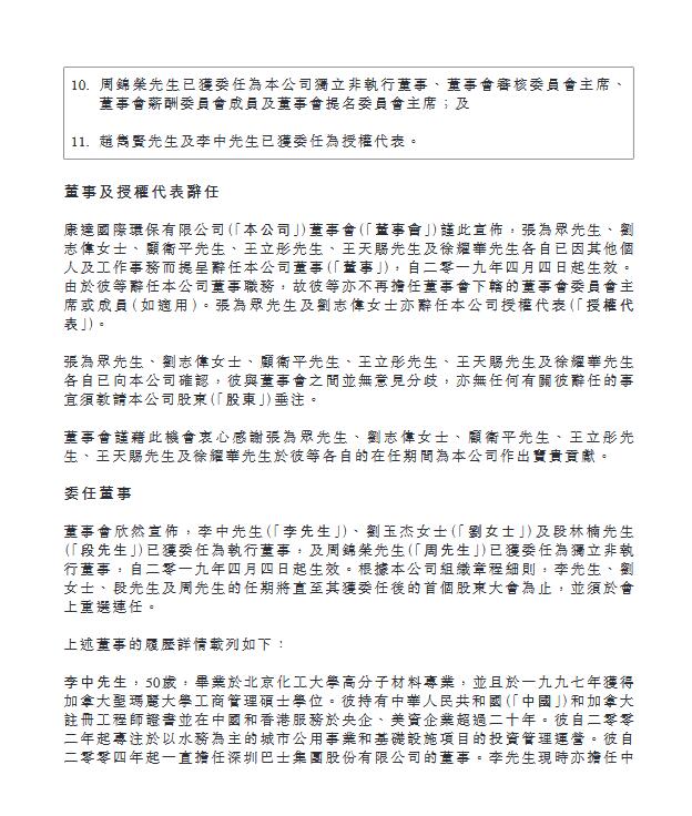 康達(dá)環(huán)保發(fā)布公告,張為眾已辭任執(zhí)行董事、董事會(huì)提名委員會(huì)成員及授權(quán)代表;劉志偉已辭任執(zhí)行董事及授權(quán)代表;顧衛(wèi)平已辭任執(zhí)行董事及董事會(huì)薪酬委員會(huì)成員;王立彤已辭任執(zhí)行董事;王天賜已辭任執(zhí)行董事;徐耀華已辭任獨(dú)立非執(zhí)行董事、董事會(huì)審核委員會(huì)主席及董事會(huì)提名委員會(huì)成員。