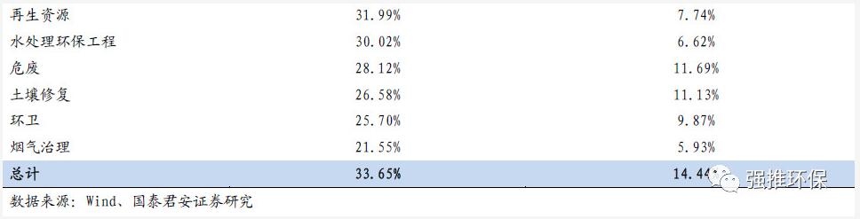 凈利潤(rùn)率方面,危廢最高,固廢資源利用最低;危廢、固廢處置、聲環(huán)境治理、環(huán)衛(wèi)、大氣治理、節(jié)能、固廢資源利用分別為19%、17%、14%、13%、8%、0.1%、-3%。