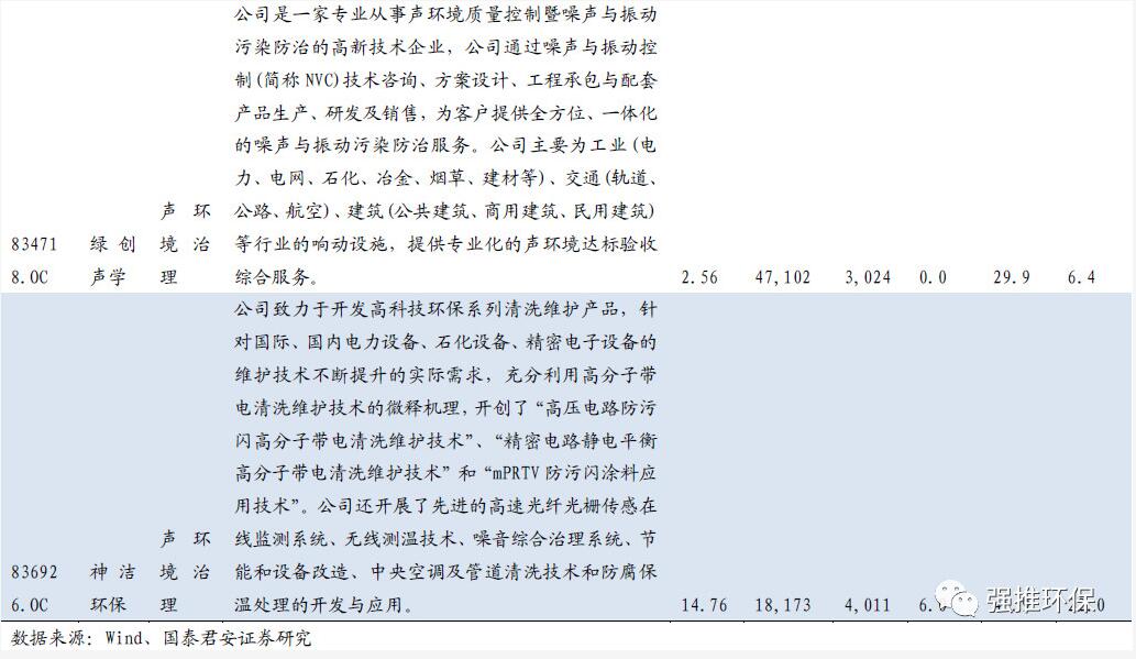 ⑤聲環(huán)境治理:綠創(chuàng)聲學(xué)(噪聲與振動(dòng)污染防治)、神潔環(huán)保(噪音治理、帶電清洗)。