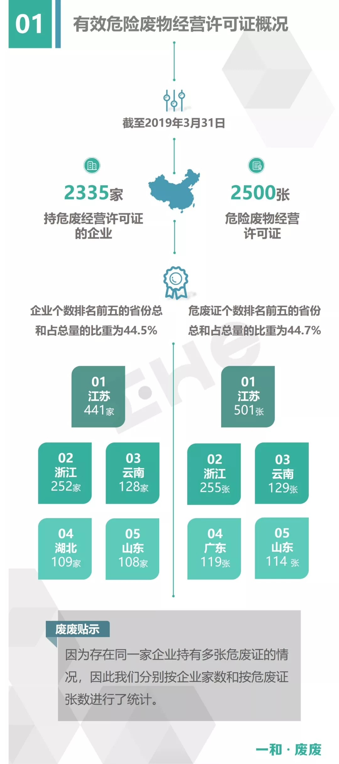 為方便危廢行業(yè)人員了解全國危廢經(jīng)營許可證情況,特將2019年3月全國危險廢物經(jīng)營許可證統(tǒng)計概況公布如下: