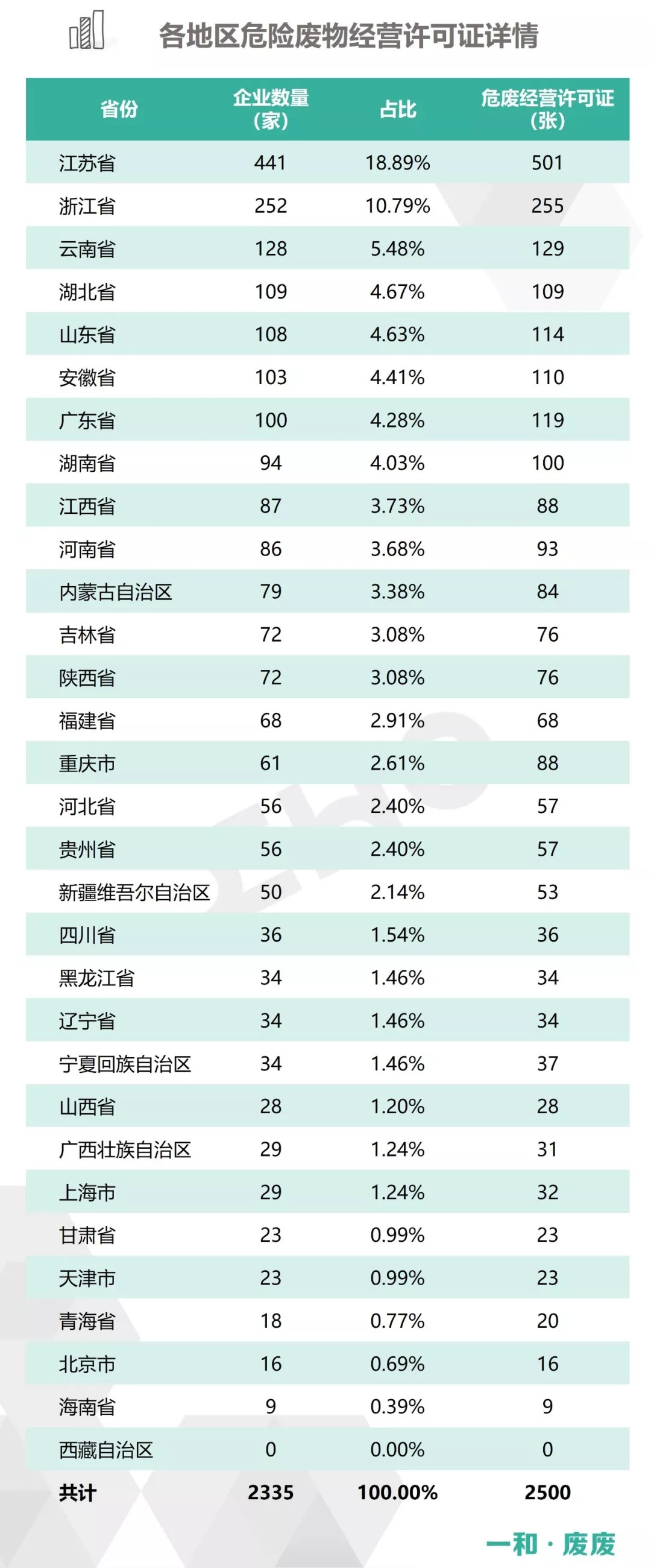5.統(tǒng)計范圍:本次數(shù)據(jù)收集統(tǒng)計的范圍為省級生態(tài)環(huán)境廳(局)官方公布的持有危險廢物經(jīng)營許可證企業(yè)的數(shù)據(jù),因此由地級市發(fā)布的醫(yī)療廢物經(jīng)營許可證、收集經(jīng)營許可證,且未納入省級生態(tài)環(huán)境廳(局)公布數(shù)據(jù)的部分,并未計入統(tǒng)計數(shù)據(jù)中。