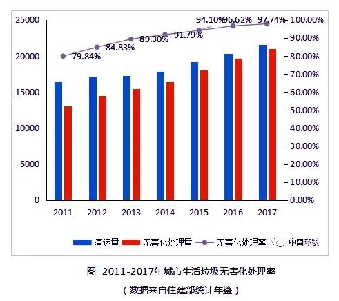 《生活垃圾處理行業(yè)2018年度發(fā)展報告》介紹,隨著我國城鎮(zhèn)化進程的推進,城市生活垃圾清運量逐年增長,2016年生活垃圾清運量已經(jīng)達到2.70億噸,其中城市生活垃圾清運量2.03億噸??h城生活垃圾清運量0.67億噸,并在以每年4%-5%的增速逐年攀升。根據(jù)2018年中國統(tǒng)計年鑒,2017年城市生活垃圾清運量達2.15億噸。