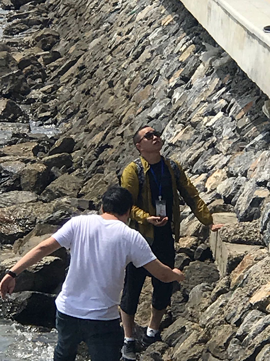 生態(tài)環(huán)境部派出的排查人員在大連市金普新區(qū)排查現(xiàn)場(chǎng)。郄建榮 攝
