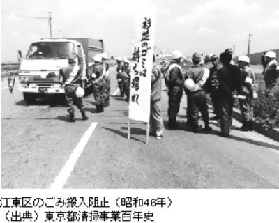 另一方面,江東區(qū)政府和區(qū)民也慢慢意識到,都政府關(guān)于垃圾填埋到1970年為止的承諾,根本沒有實現(xiàn)的可能性。到了1971年,平均每天有5000輛以上的搬運(yùn)車,將東京中心23區(qū)所生產(chǎn)的垃圾中的70%搬運(yùn)到江東區(qū)進(jìn)行填埋。由此產(chǎn)生的交通堵塞、蚊蟲叢生、空氣污染甚至是火災(zāi),給江東區(qū)區(qū)民的日常生活造成重大困擾。
