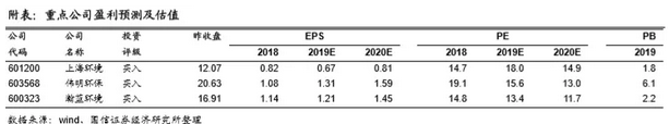 ③ 上海環(huán)境未來看點(diǎn)主要在于:1)水務(wù)和危廢資產(chǎn)注入;2)垃圾焚燒發(fā)電2020 年將迎來項(xiàng)目投運(yùn)高峰期,垃圾焚燒業(yè)務(wù)有望明顯放量;3)污水業(yè)務(wù)提標(biāo)改 造帶來的增量空間;4)可能的外延收購及新興領(lǐng)域的市場(chǎng)拓展。預(yù)計(jì)公司 2019-2021 年實(shí)現(xiàn)歸母凈利潤 5.83/7.08/8.13 億,對(duì)應(yīng) PE19/16/14 倍,給予 “買入”評(píng)級(jí)。