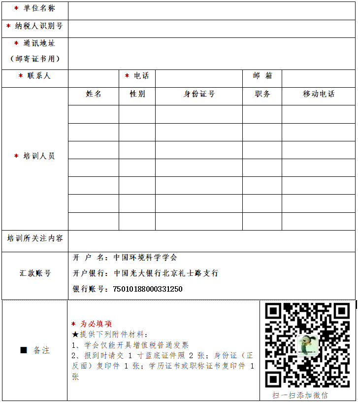 證書費等。由中國環(huán)境科學學會收取培訓費并開具發(fā)票(一律開具增值稅普通發(fā)票),請在匯款時備注“環(huán)境修復項目經(jīng)理”培訓費用(參加培訓人員姓名),多位人員參加則在括號內(nèi)逐一填寫參加人員姓名,例:環(huán)境修復項目經(jīng)理培訓費(小明/小華/小雷)。住宿可統(tǒng)一安排,費用自理。