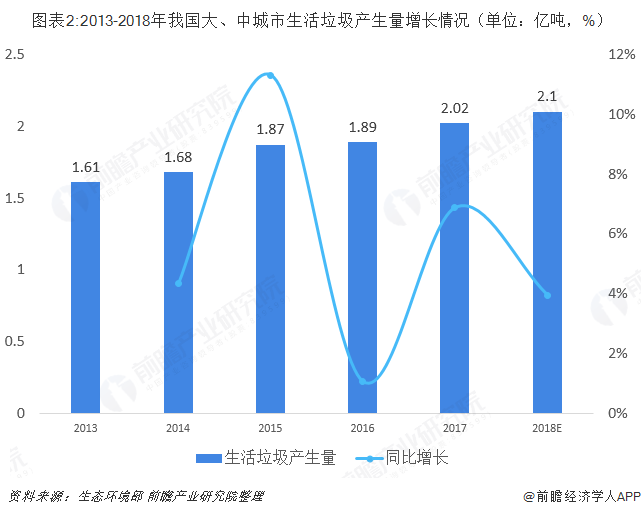 隨著越來越多的城市開始實施垃圾分類政策,我國垃圾分類產業(yè)將推動再生資源行業(yè)、固廢處理行業(yè)、環(huán)衛(wèi)設施行業(yè)和垃圾回收產業(yè)等產業(yè)鏈各端的多元化發(fā)展。目前,我國生活垃圾產生量呈持續(xù)攀升趨勢,從而也帶動了國內環(huán)衛(wèi)設施行業(yè)的快速發(fā)展。