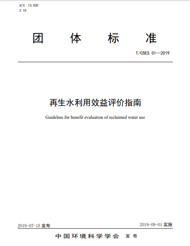 2019年7月15日,中國環(huán)境科學(xué)學(xué)會(huì)團(tuán)體標(biāo)準(zhǔn)《再生水利用效益評價(jià)指南》正式發(fā)布,標(biāo)準(zhǔn)編號為“T/CSES 01-2019”。該標(biāo)準(zhǔn)由中國環(huán)境科學(xué)學(xué)會(huì)水處理與回用專業(yè)委員會(huì)(掛靠單位:清華大學(xué))胡洪營教授團(tuán)隊(duì)牽頭,中國城市規(guī)劃設(shè)計(jì)研究院、北京市環(huán)境保護(hù)科學(xué)研究院、信開水環(huán)境投資有限公司、光大水務(wù)(深圳)有限公司等作為參編單位共同起草,充分吸納了生產(chǎn)、科研、用戶等方面有代表性的技術(shù)力量共同編寫標(biāo)準(zhǔn),形成以市場為導(dǎo)向、研究機(jī)構(gòu)為支撐、產(chǎn)學(xué)研用相結(jié)合的組織模式。