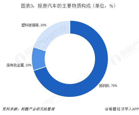 報廢汽車主要含有黑色金屬、有色金屬、貴金屬(催化劑)、電子設備、玻璃、車用塑料等。其中,廢鋼等黑色金屬約占70%,銅鋁等有色金屬約占10%,其他物料約占20%。其中廢鋼鐵、有色金屬90%以上都可以回收利用,玻璃、塑料等的回收利用率也可達50%以上??梢妶髲U汽車的再回收利用價值較大。