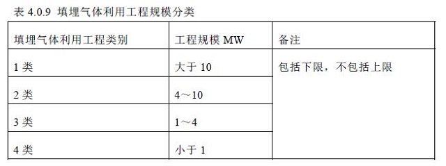 4.0.9 填埋氣體利用工程規(guī)??砂刺盥駳怏w利用系統(tǒng)最大輸出能量來表示。填埋氣體利用工程規(guī)模分類應(yīng)符合表4.0.9 的規(guī)定: