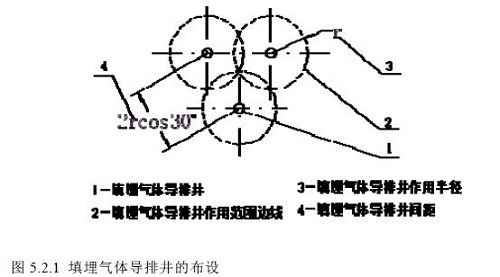 5.1.1 填埋氣體的導(dǎo)排設(shè)施宜采用導(dǎo)氣井與導(dǎo)氣盲溝相結(jié)合的方式,導(dǎo)排井和導(dǎo)排盲溝的布設(shè)數(shù)量應(yīng)根據(jù)單個導(dǎo)氣井和導(dǎo)氣盲溝的導(dǎo)氣作用范圍和垃圾堆體面積確定,垃圾堆體填埋氣體導(dǎo)氣設(shè)施覆蓋率應(yīng)不小于95%。