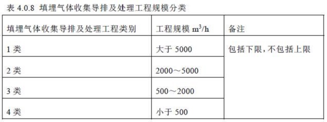 填埋氣體收集導(dǎo)排及處理工程規(guī)模分類應(yīng)符合表4.0.8 的要求: