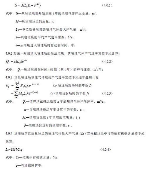 4.0.6 填埋氣體回收利用工程設(shè)計前,宜進(jìn)行現(xiàn)場抽氣試驗,利用試驗數(shù)據(jù)對填埋場垃圾的產(chǎn)氣常數(shù)進(jìn)行估算,并以此對氣體利用期間填埋氣體產(chǎn)生量進(jìn)行逐年估算。無現(xiàn)場抽氣試驗條件的,可采用相關(guān)經(jīng)驗參數(shù)和理論數(shù)學(xué)模型對填埋氣體產(chǎn)生量進(jìn)行逐年估算。