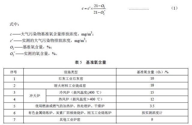 實測的工業(yè)爐窯污染物排放濃度,應按公式(1)折算為基準氧含量排放濃度。各類工業(yè)爐窯的基準氧含量按表5的規(guī)定執(zhí)行。