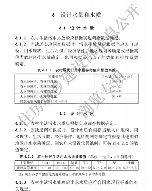 2、設(shè)計水量和水質(zhì)。不同地區(qū)農(nóng)村生活習(xí)慣、生活水平、氣候條件、水源、水資源結(jié)構(gòu)的差異,導(dǎo)致農(nóng)村污水排放和水質(zhì)差異較大,難以給出具體的設(shè)計值。標(biāo)準(zhǔn)所列的數(shù)據(jù)范圍僅在沒有基本數(shù)據(jù)的情況下供當(dāng)?shù)貐⒖?。實地調(diào)查應(yīng)是確定農(nóng)村污水排放和水質(zhì)的首要選擇。