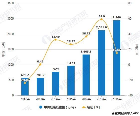 2012-2018年中國危廢處置量統(tǒng)計(jì)及增長情況預(yù)測