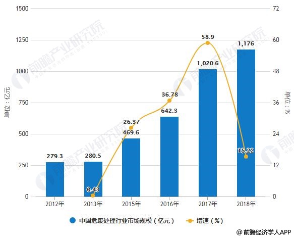2012-2018年中國危廢處理行業(yè)市場規(guī)模統(tǒng)計(jì)及增長情況