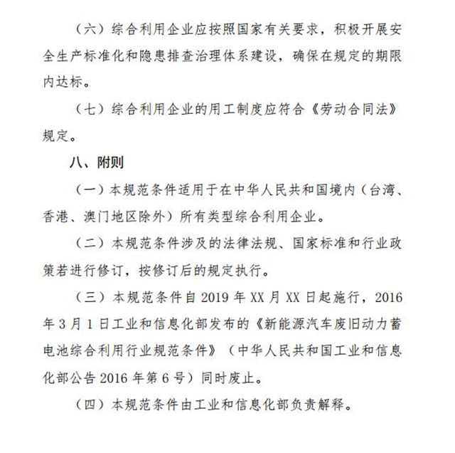 為推動新能源汽車動力蓄電池回收利用,適應(yīng)行業(yè)發(fā)展新形勢,引導(dǎo)行業(yè)健康發(fā)展,在深入調(diào)研基礎(chǔ)上,工業(yè)和信息化部對2016年公告發(fā)布的《新能源汽車廢舊動力蓄電池綜合利用行業(yè)規(guī)范條件》《新能源汽車廢舊動力蓄電池綜合利用行業(yè)規(guī)范公告管理暫行辦法》進行了修訂。現(xiàn)將修訂稿向社會公開征求意見,如有意見或建議,請于2019年10月30日前反饋工業(yè)和信息化部節(jié)能與綜合利用司。