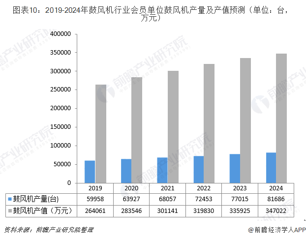 未來,國內(nèi)分布式能源、垃圾發(fā)電、污水處理、大氣污染治理行業(yè)的持續(xù)推進,將進一步刺激鼓風機行業(yè)的需求。同時競爭態(tài)勢看,國內(nèi)鼓風機企業(yè)與國外優(yōu)秀鼓風機品牌在技術(shù)上的差距在逐漸縮小,未來國內(nèi)鼓風機企業(yè)將進一步占據(jù)國內(nèi)鼓風機市場份額?;谝陨蟽牲c考量,前瞻認為,鼓風機市場仍有較大的發(fā)展空間,預(yù)計到2024年,會員單位鼓風機產(chǎn)量將突破8萬臺,會員單位鼓風機產(chǎn)值將突破34億元。